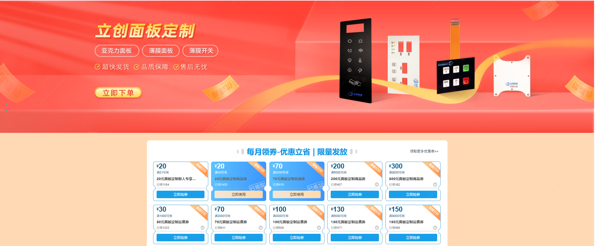 老用户:每月推出券额不等的满减券、运费券,让您的面板定制更优惠。(数量有限,先到先得)